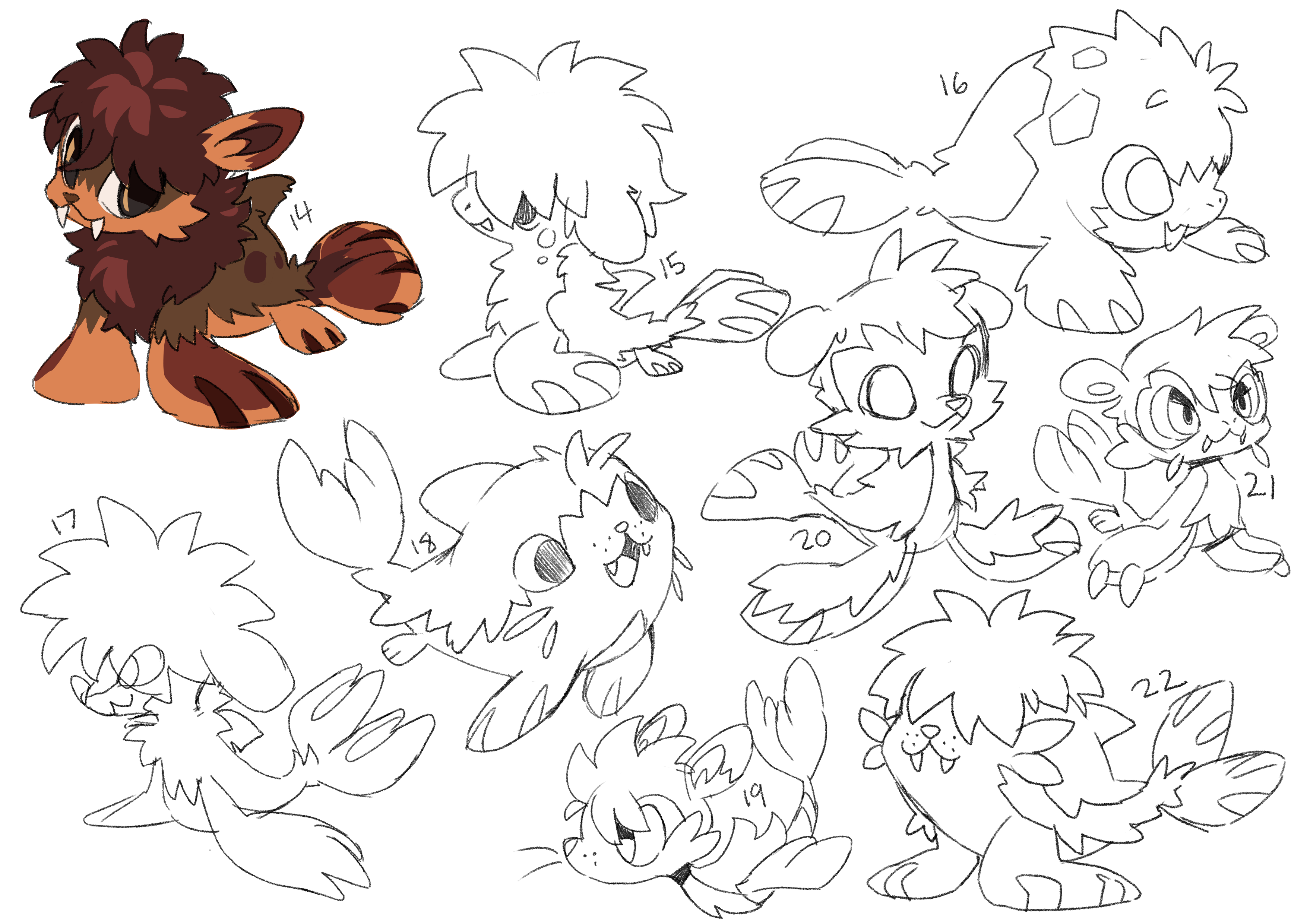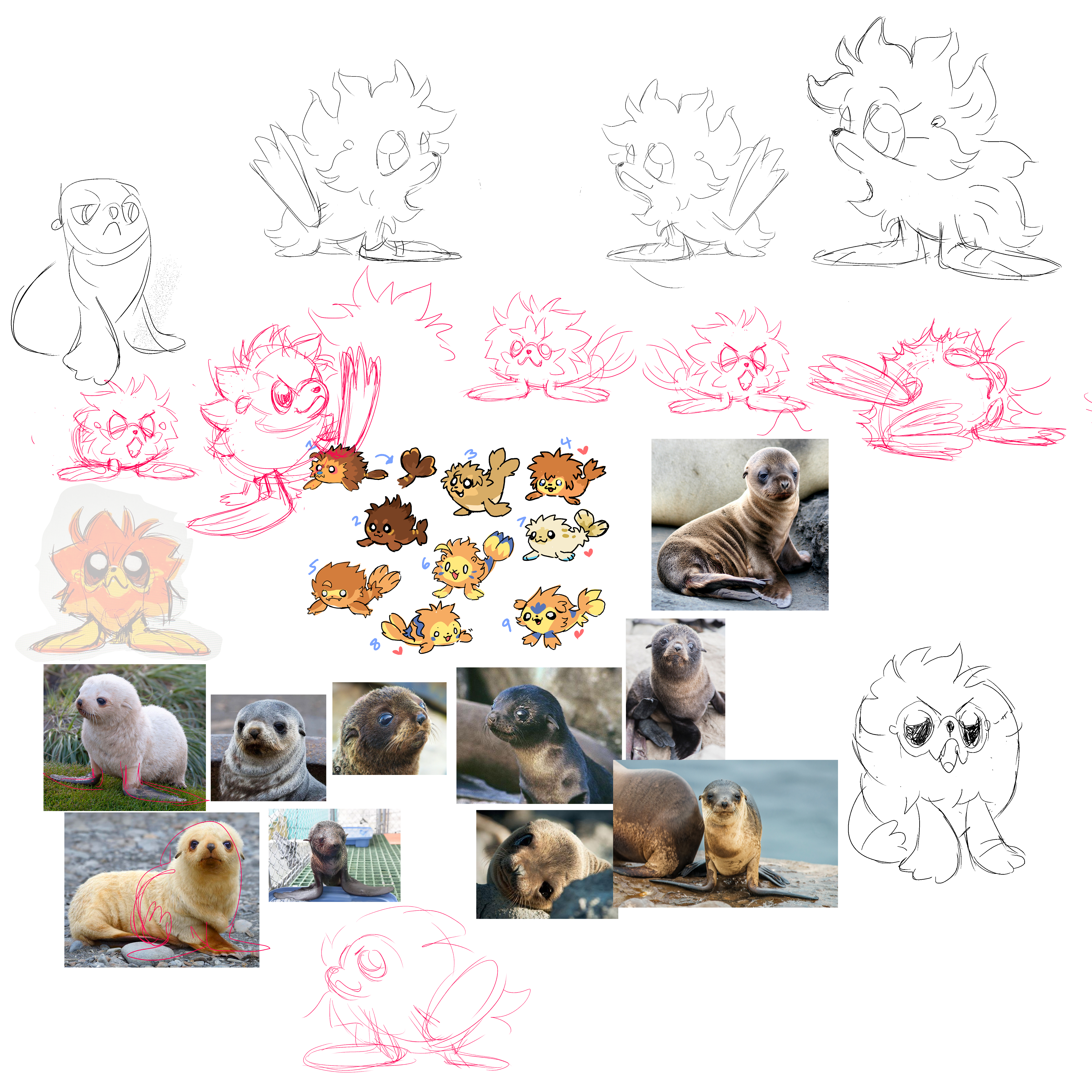 This is probably a great time to mention that Irischroma loves pompadours. I don’t know why, I don’t think there may even be a particular reason. But left to their own devices, Irischroma would often introduce a pompadour somewhere in designs they played with, sometimes even accidentally. And that is what came through here in their development of the beach bro seal, including a first sketch idea for an immature form based on them. Looking at the adult’s sheet, I couldn’t find anything wrong with the designs, and in fact I was really excited by the strong personality already coming across, so I felt that it was basically finished and ready for animation. These are the sketches we used in beta builds for years. But while Alexis loved the personality and poses, she had doubts about the design, so we paused further work on its concept. After a while, feeling like we needed to make some progress on it somehow, we decided to explore more ideas for the immature stage.