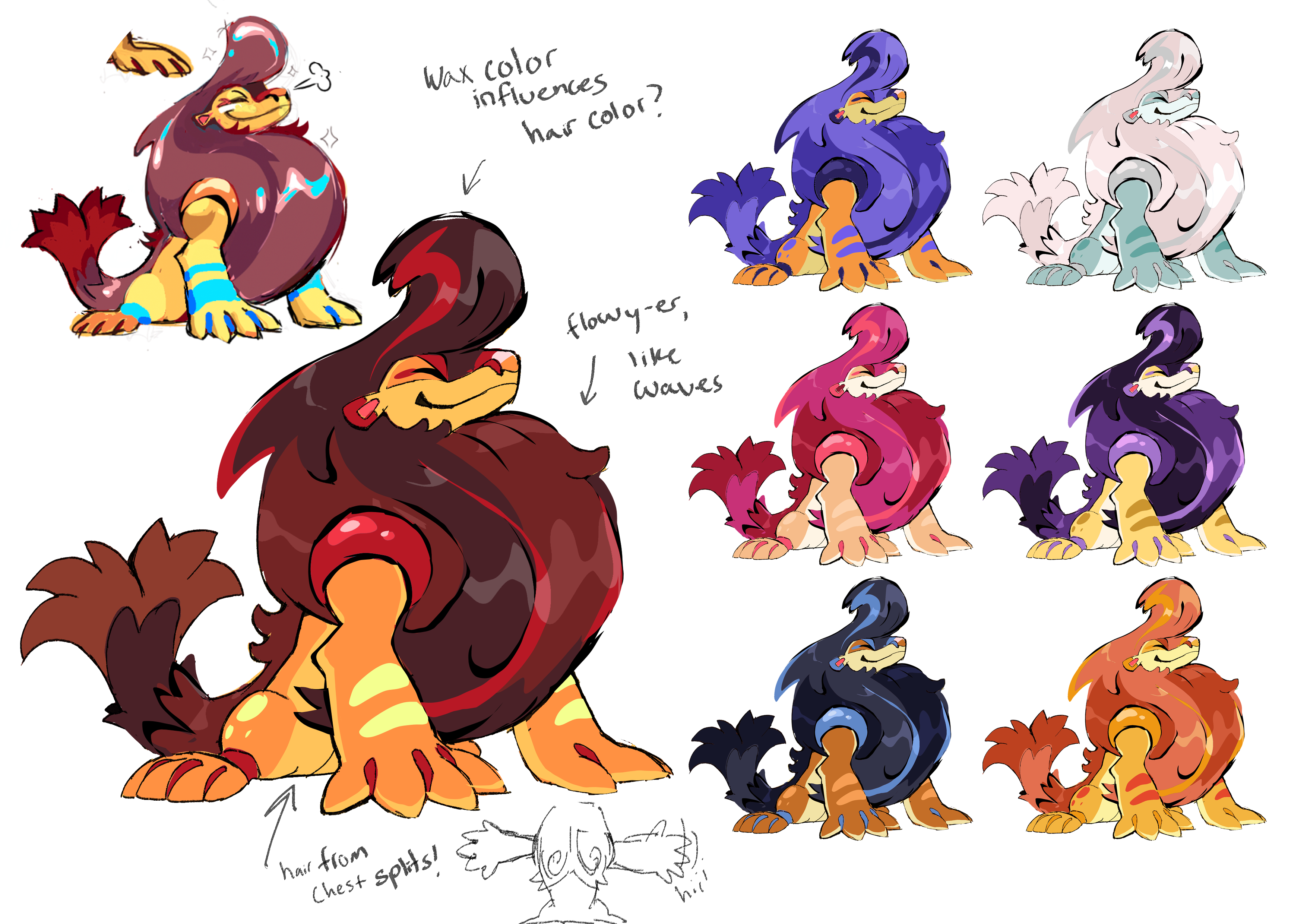 This was where I had an idea that, at the time, seemed fairly ridiculous. The chest hair and pompadour were the key elements of Iris’ initial seal sketches, but they had nothing to do with the “Beach bro” theme, and it made any attempt to make them more “beach bro” just feel tacked-on and stupid. So why not make the hair the theme? Maybe the adult seal was very careful about their hair care, and their flippers produced hair wax to keep it smooth and shapely, while also making a smooth surfboard-like surface to glide along the beach. Riffing on that, the immature form can’t produce its own wax, so it would be an untamed hairball monster. Alexis was lukewarm on the idea, but Iris was all-in and went ahead exploring new ideas for the immature form.