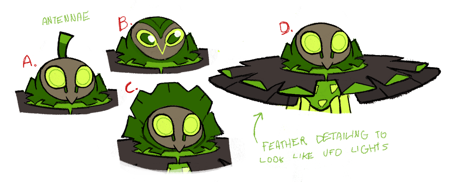 With this data in hand, we came to Harlow with a request for an immature form of Albrax that had gangly long legs and a non-round design. We were so excited to realize the idea, we had the name Yueffowl ready to go before the first sketch was even started (first draft names: Leggstraterrestrial, Hooteffo).