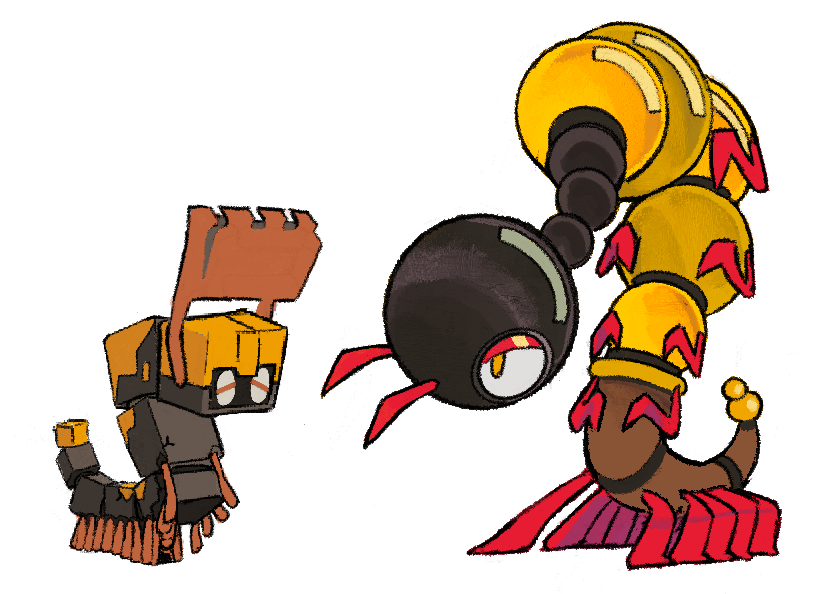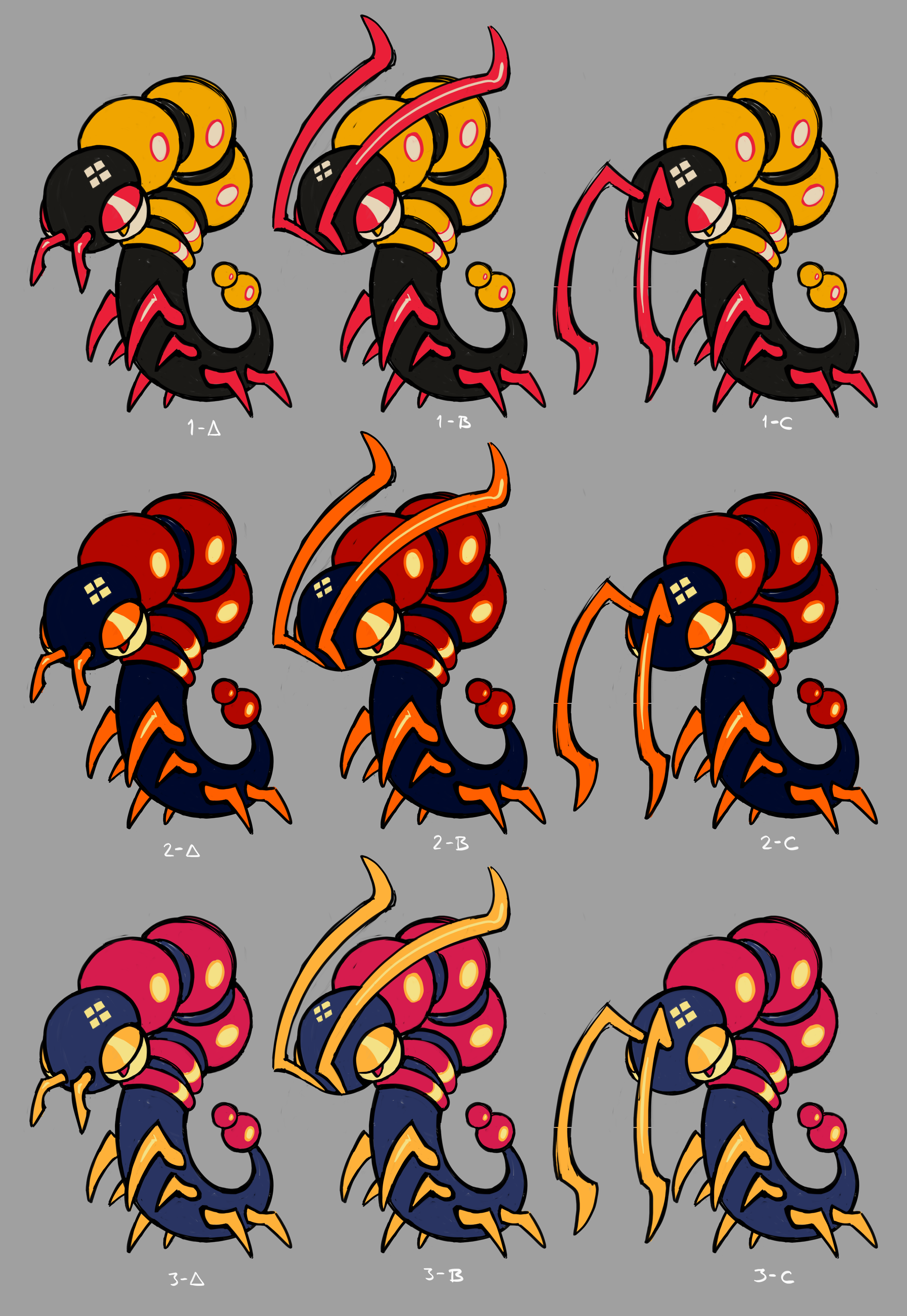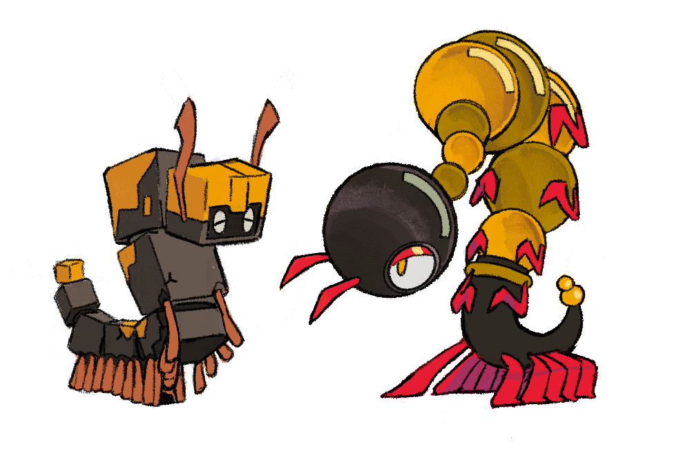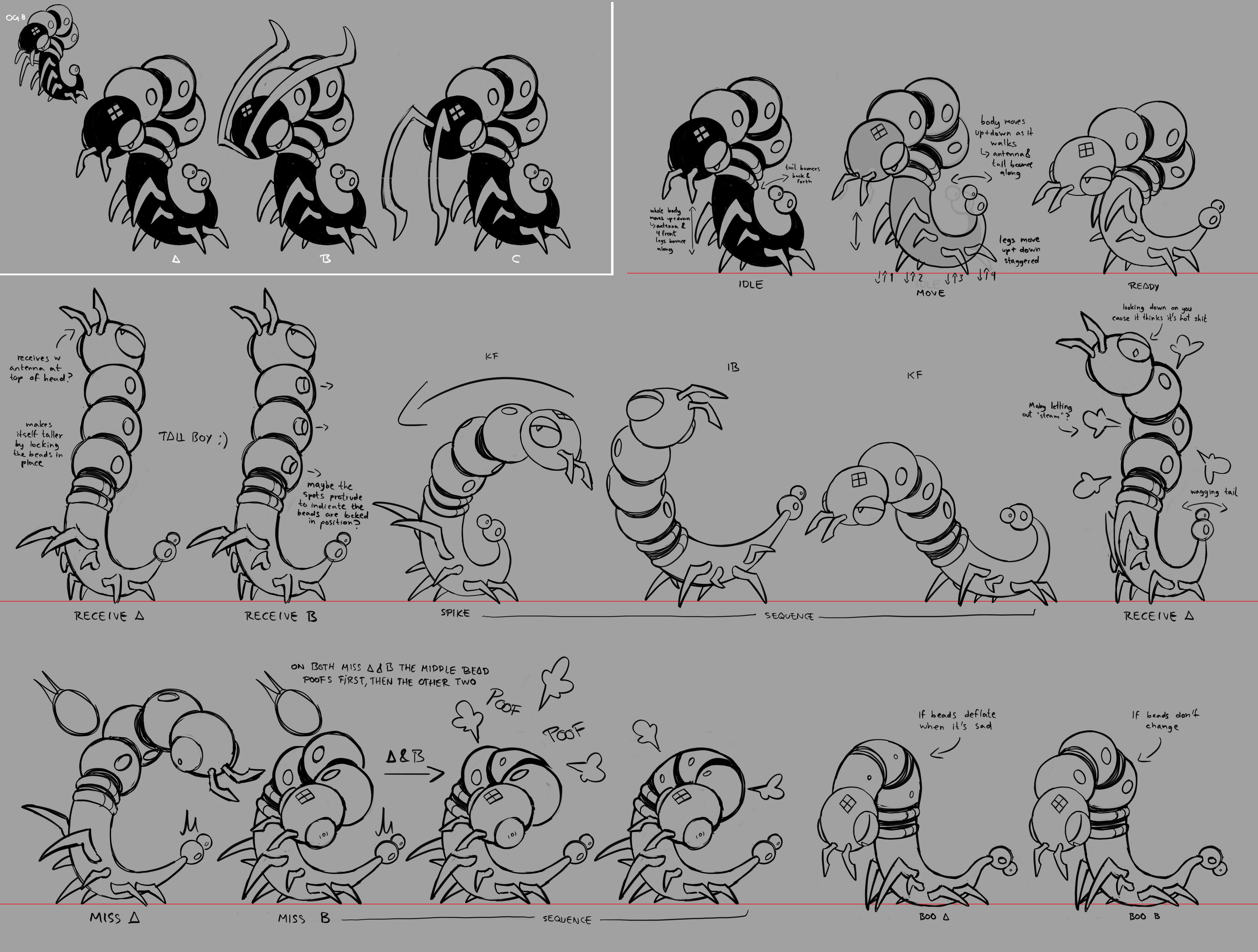Enter Harlow Diggs, whose past experience with entomology had proven a strength on our team time and again. She identified pauropodas as a potential insect to draw inspiration from and offered a few ideas, and shared some very old sketches she’s done trying to adapt the same insects before. There were tons of ideas here with great appeal. But without any theme tying the ideas together, nothing really felt like it had any connection to the tall millipede they were based on.