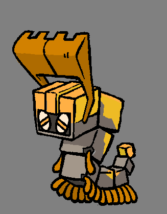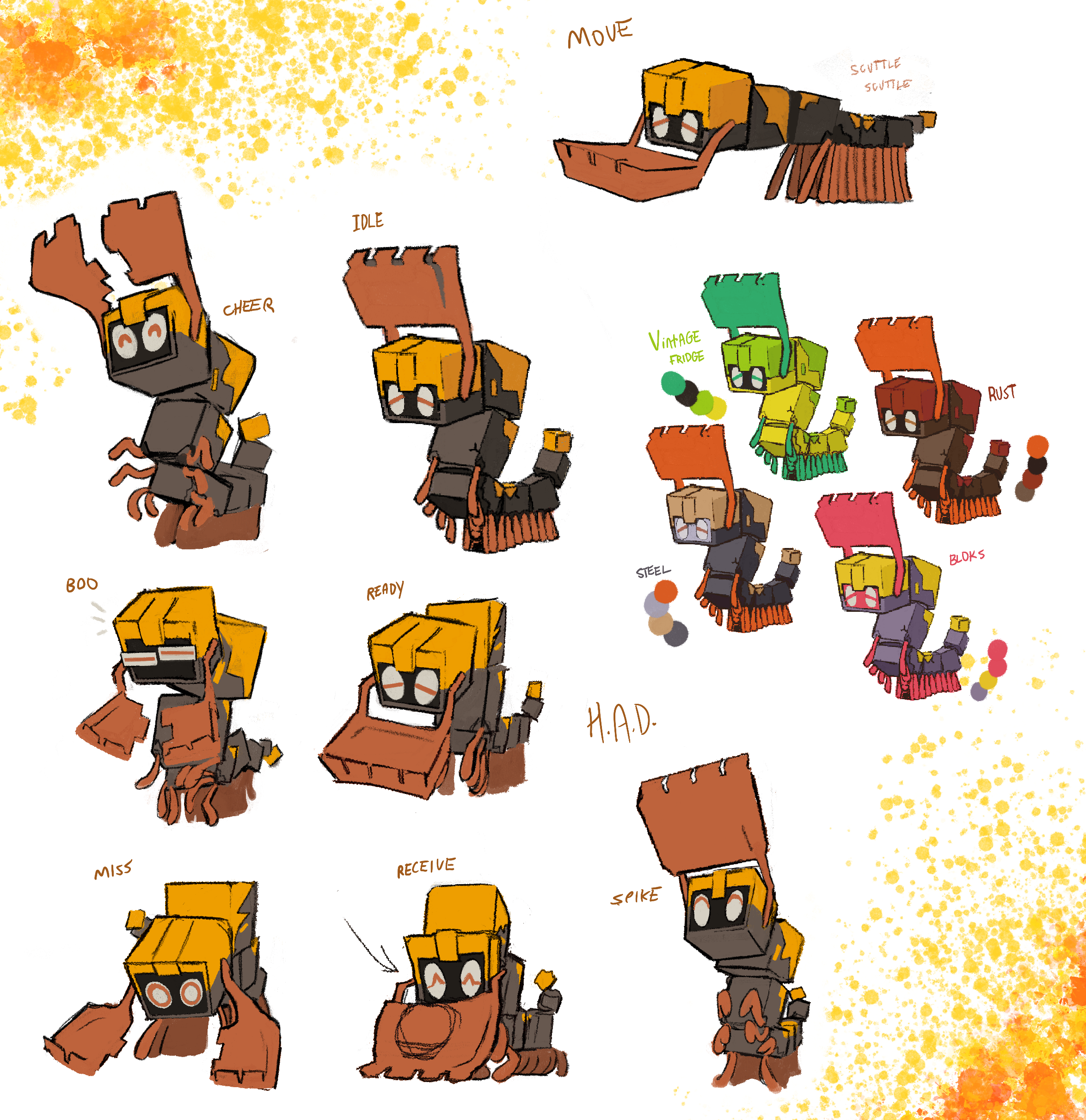 I don’t know if the idea clicked for the rest of the team, at least at first, but all the pieces snapped into place once we saw the designs side by side. Harlow pushed into yellow-and-black for the color palette, emphasizing the “construction” theme and codifying this Beastie’s in-game role as a Body type. Somehow, we’d found a way to explain the bizarre shapes of Karen’s original concept, injecting a theme into it without disrupting what had made it so appealing in the first place. It was a huge win. This was where Alexis suggested that we augment the immature form’s antenna to take inspiration from dirt pushers, to solidify their role as an earth-mover that teamed up with the wrecking ball adults.