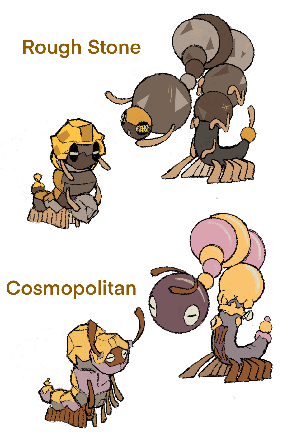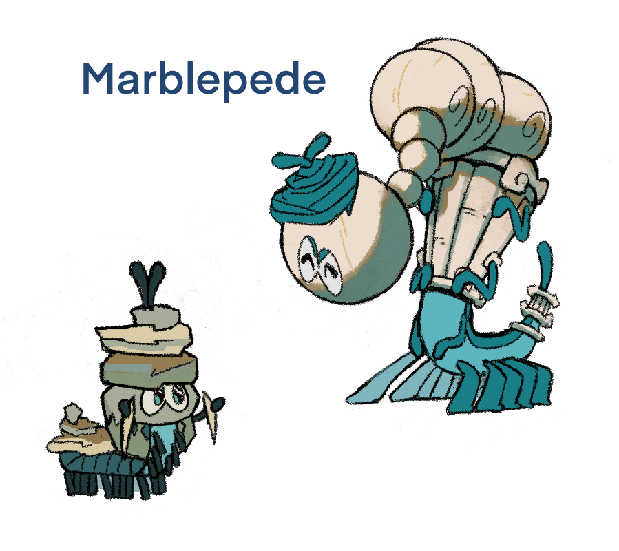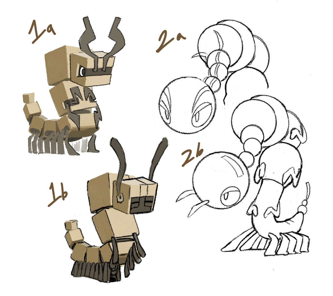 We all loved Karen’s design, but with their blessing, Harlow opened it back up and started messing with it to see how they could pair it up with a new immature form. She honed in on a “rough stone” to “polished stone” concept to rationalize why the adult was made of spheres. Developing the ideas side by side like this really helped us work out theming at this stage. This was where I pulled up Harlow’s oldest pauropoda sketches and highlighted a particularly cube-shaped one, asking if we could use that idea for the immature form here, since “cubes to spheres” would be a really satisfying geometric character/visual arc.