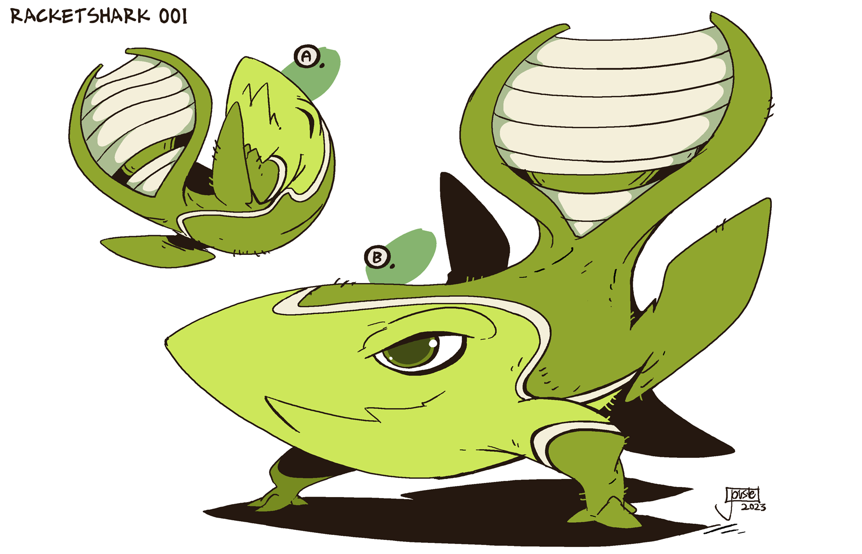 The large shark was based on thresher sharks, which use their tail to create underwater shockwaves (incredibly cool). Alexis imagined the tail as a massive implement that could thwack the ball super hard, and then drew up a cute little baby version to go with it. I found some process drawings for the little shark, who we called Shuppy: