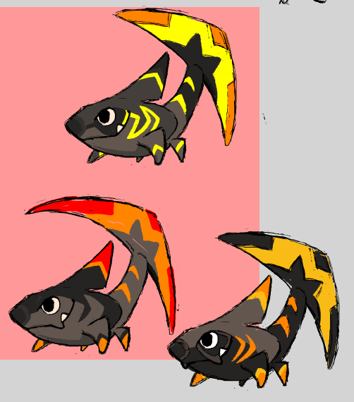 On top of everything else she needed to get done in time for release, Alexis was iterating on ideas to merge the spotted-ball theme of Pubber with our existing adult shark design. The key issues were; Pubber's design has a more solid/three dimensional feeling compared to the original sharks, Pubber's colours are completely different, and (maybe most importantly) there was absolutely no common theming or personality between the two. Pubber is a long, cute, floppy critter who curls into a ball, and the bigshark is a toothy guy who hits things really hard with their giant tail. We came up with some designs that kind of approached solving the first two - but the 3rd issue was still totally unaddressed. On top of that, we were struggling to find a design whose appeal surpassed the original bigshark sketch we already had waiting in the game. Everything that brought them closer to Pubber also took them further away from what worked in that design.