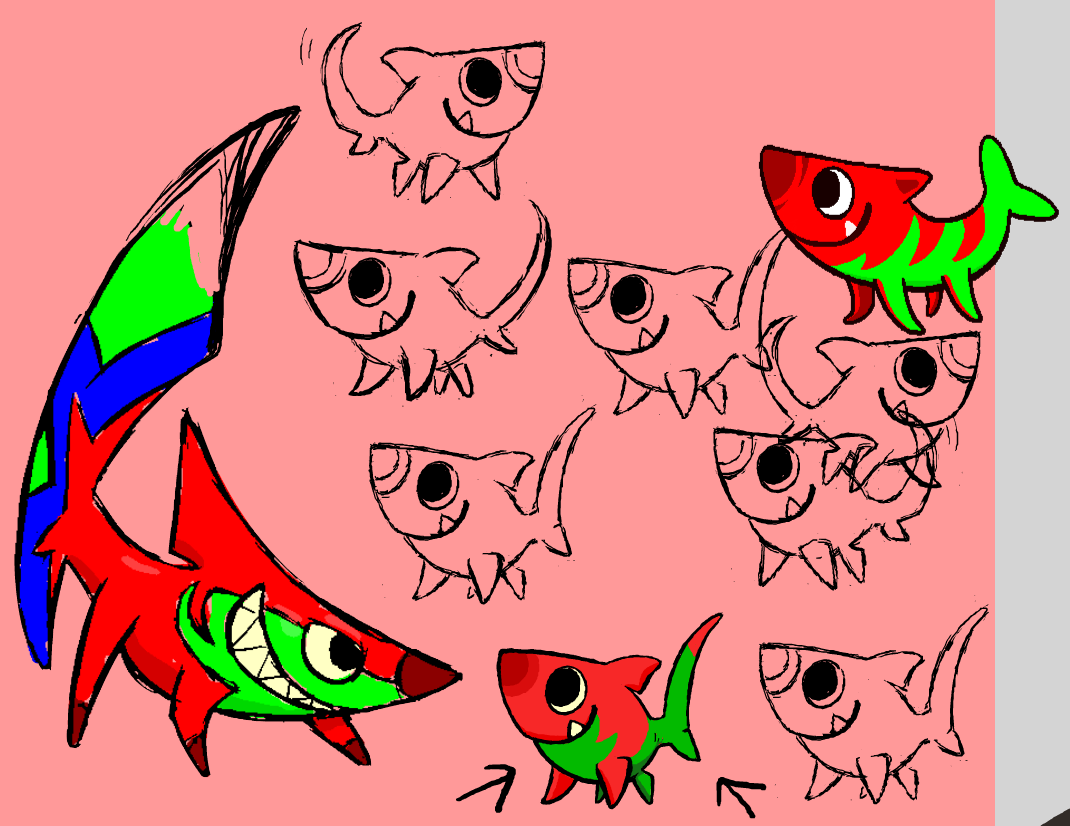 Like before, we had drawings that were good but nothing that felt like “the one.” The big sharks especially felt like they were hitting the prompt, but had lost everything appealing about the original big shark design. We were really stuck on this one and wound up putting it into hibernation for a while, keeping the original prototype sketches as placeholders in the game.