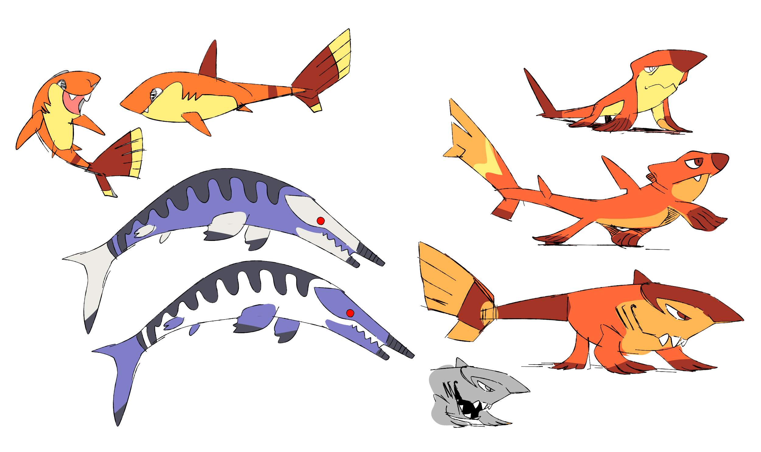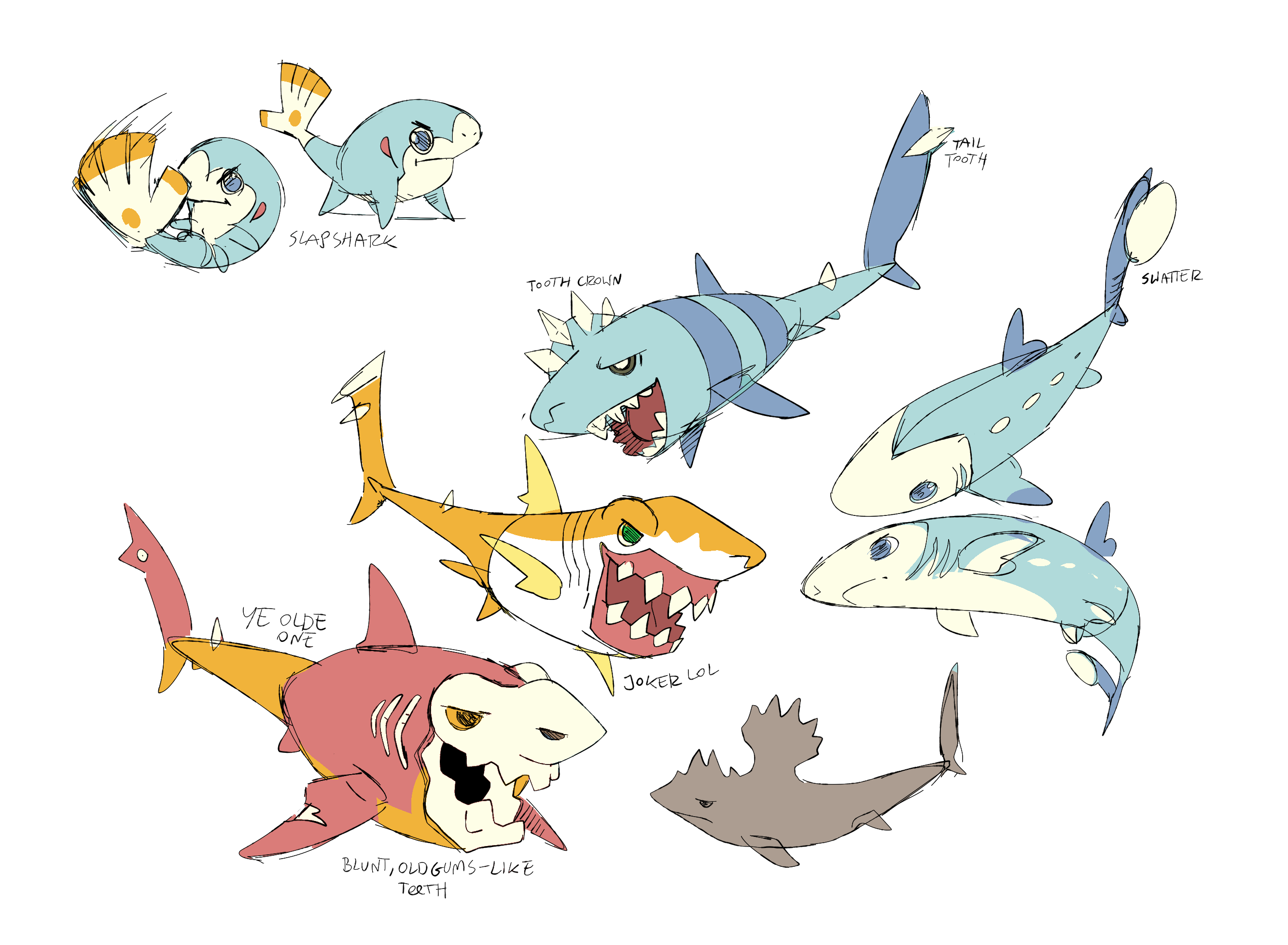 Before we knew it, Playtests were coming out, and we’d soon be debuting the Chroma Sea area to players with no final shark design. At the eleventh hour, while sick with Covid, Alexis locked herself in a room and drew shark babies searching for some idea that was going to work. That’s when we got these drawings: